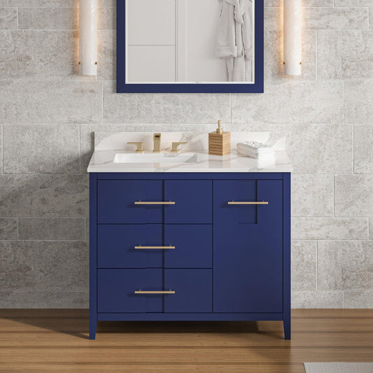 Hardware Resources Jeffrey Alexander Katara 42" Hale Blue Freestanding Vanity With Left Offset, Calacatta Vienna Quartz Vanity Top, Backsplash and Rectangle Undermount Sink