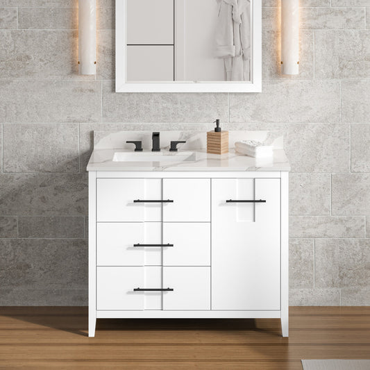 Hardware Resources Jeffrey Alexander Katara 42" White Freestanding Vanity With Left Offset, Calacatta Vienna Quartz Vanity Top, Backsplash and Rectangle Undermount Sink