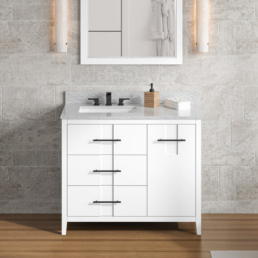 Hardware Resources Jeffrey Alexander Katara 42" White Freestanding Vanity With Left Offset, White Carrara Marble Vanity Top, Backsplash and Rectangle Undermount Sink