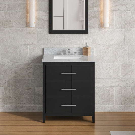 Hardware Resources Jeffrey Alexander Katara 30" Black Freestanding Vanity With White Carrara Marble Vanity Top, Backsplash and Rectangle Undermount Sink