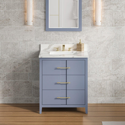Hardware Resources Jeffrey Alexander Katara 30" Hale Blue Freestanding Vanity With Lavante Cultured Marble Vessel Vanity Top, Backsplash and Rectangle Undermount Sink