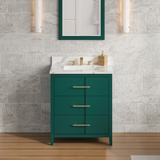 Hardware Resources Jeffrey Alexander Katara 30" Green Freestanding Vanity With Calacatta Vienna Quartz Vanity Top, Backsplash and Rectangle Undermount Sink