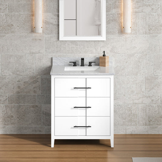 Hardware Resources Jeffrey Alexander Katara 30" White Freestanding Vanity With White Carrara Marble Vanity Top, Backsplash and Rectangle Undermount Sink