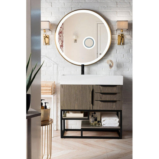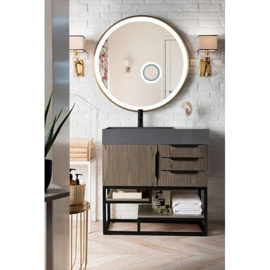 James Martin Columbia 36" Single Ash Gray Bathroom Vanity With Matte Black Hardware and 6" Glossy White Composite Countertop