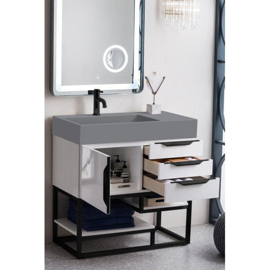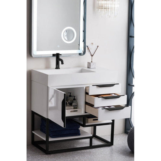 James Martin Columbia 36" Single Glossy White Bathroom Vanity With Matte Black Hardware and 6" Glossy White Composite Countertop