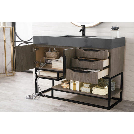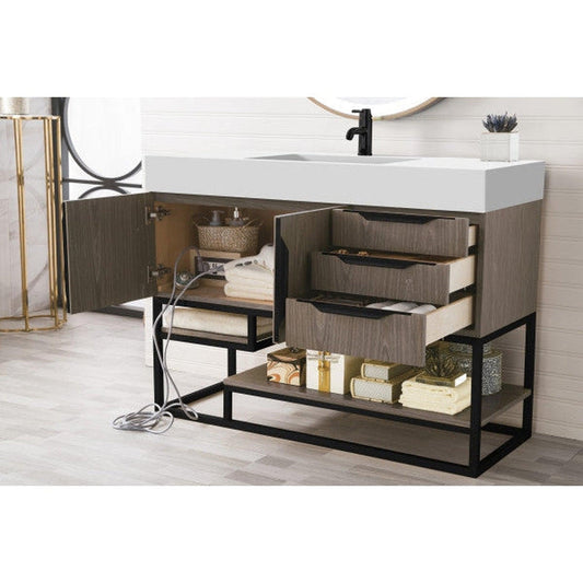 James Martin Columbia 48" Single Ash Gray Bathroom Vanity With Matte Black Hardware and 6" Glossy White Composite Countertop