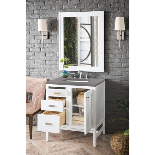 James Martin Addison 30" Single Glossy White Bathroom Vanity With 1" Gray Expo Quartz Top and Rectangular Ceramic Sink