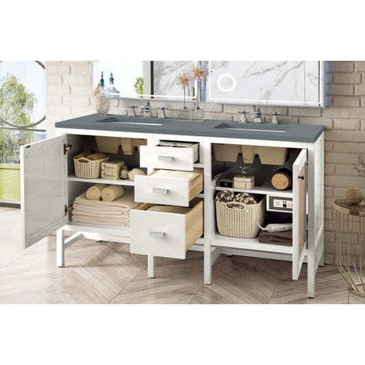 James Martin Addison 60" Double Glossy White Bathroom Vanity With 1" Classic White Quartz Top and Rectangular Ceramic Sink