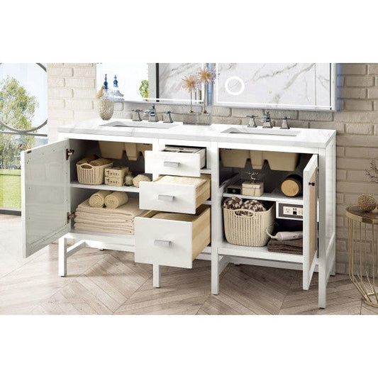 James Martin Addison 60" Double Glossy White Bathroom Vanity With 1" Carrara White Marble Top and Rectangular Ceramic Sink