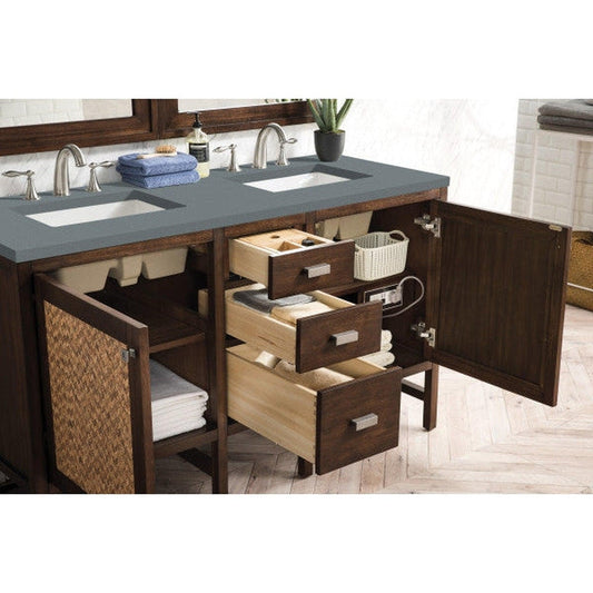 James Martin Addison 60" Double Mid Century Acacia Bathroom Vanity With 1" Gray Expo Quartz Top and Rectangular Ceramic Sink