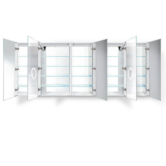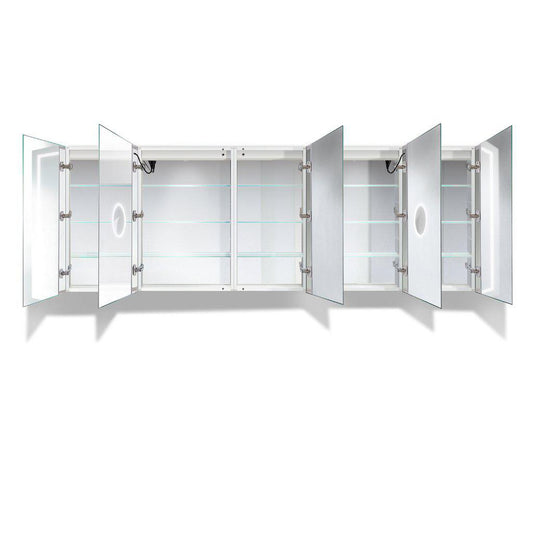 Krugg Reflections Svange 102" x 36" 5000K Double Penta-View Left-Left-Right-Right-Right Opening Recessed/Surface-Mount Illuminated Silver Backed LED Medicine Cabinet Mirror With Built-in Defogger, Dimmer and Electrical Outlet