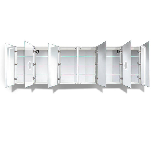 Krugg Reflections Svange 120" x 36" 5000K Double Hexa-View Left-Left-Left-Right-Right-Right Opening Recessed/Surface-Mount Illuminated Silver Backed LED Medicine Cabinet Mirror With Built-in Defogger, Dimmer and Electrical Outlet