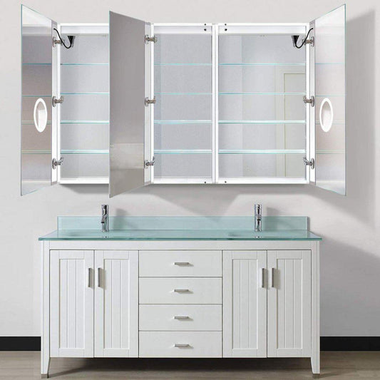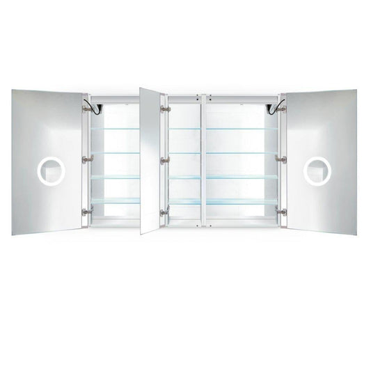 Krugg Reflections Svange 66" x 42" 5000K Double Tri-View Left-Left-Right Opening Recessed/Surface-Mount Illuminated Silver Backed LED Medicine Cabinet Mirror With Built-in Defogger, Dimmer and Electrical Outlet