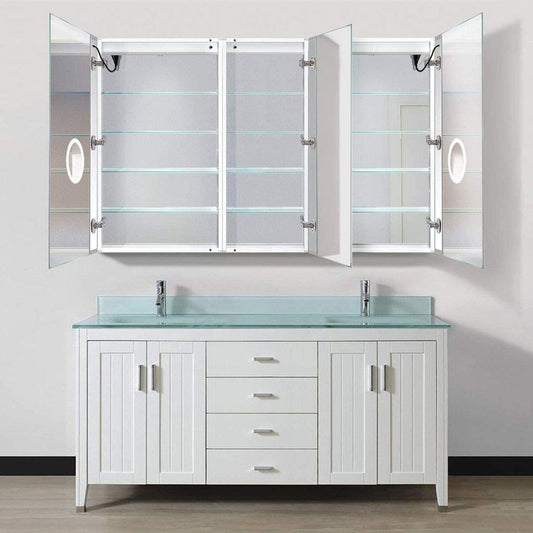 Krugg Reflections Svange 66" x 42" 5000K Double Tri-View Left-Right-Right Opening Recessed/Surface-Mount Illuminated Silver Backed LED Medicine Cabinet Mirror With Built-in Defogger, Dimmer and Electrical Outlet