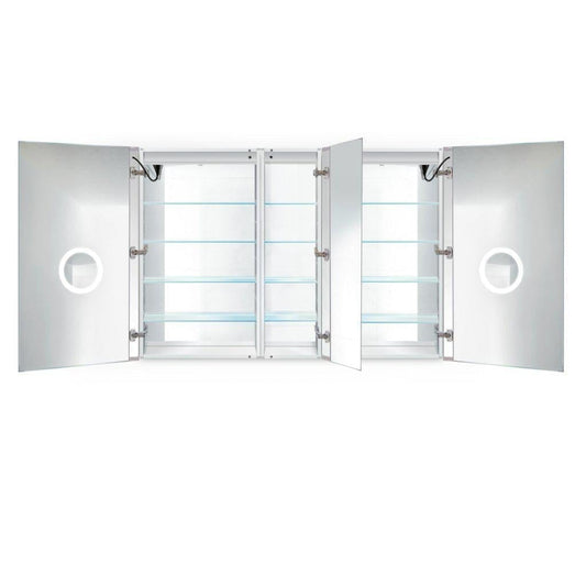 Krugg Reflections Svange 66" x 42" 5000K Double Tri-View Left-Left-Right Opening Recessed/Surface-Mount Illuminated Silver Backed LED Medicine Cabinet Mirror With Built-in Defogger, Dimmer and Electrical Outlet