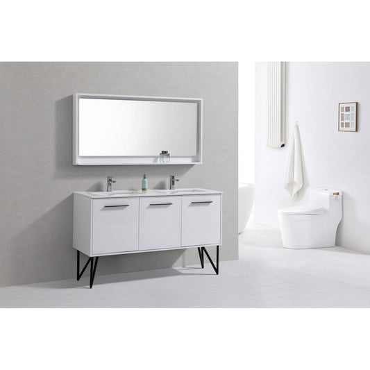 Kubebath Eiffel 60" High Gloss White Freestanding Modern Bathroom Vanity With Quartz CVanity Top & Double Ceramic Undermount Sink