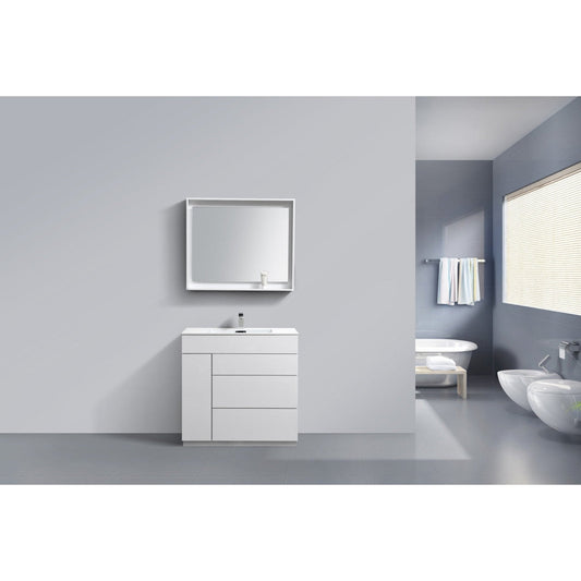KubeBath Milano 36" High Gloss White Freestanding Modern Bathroom Vanity With Aluminum Kick Plate & Acrylic Composite Integrated Sink With Overflow and 36" White Framed Mirror With Shelf