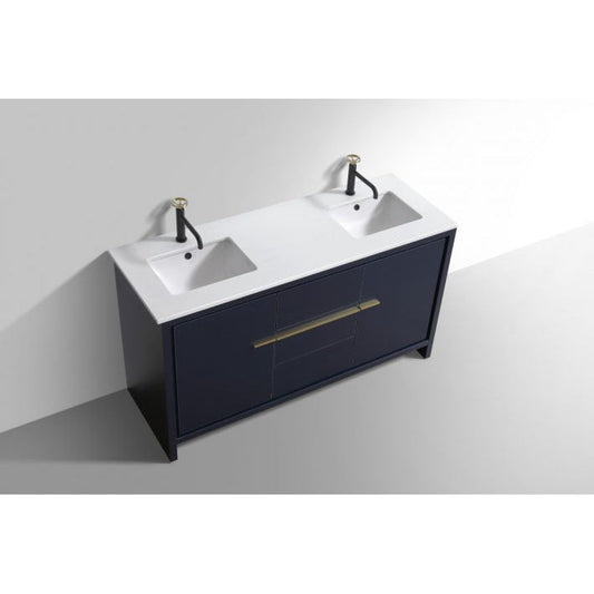 KubeBath Dolce 60" Blue Freestanding Modern Bathroom Vanity With Quartz Vanity Top & Ceramic Double Sink With Overflow and 60" White Framed Mirror With Shelf