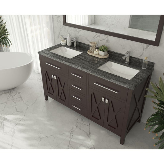 Laviva Wimbledon 60" Brown Vanity Base and Black Wood Marble Countertop With Double Rectangular Ceramic Sinks