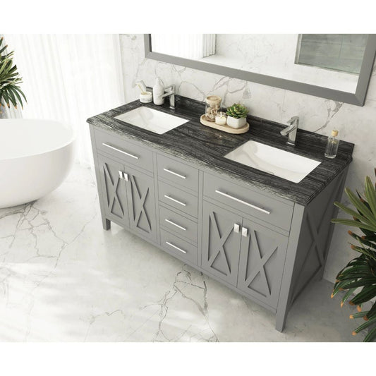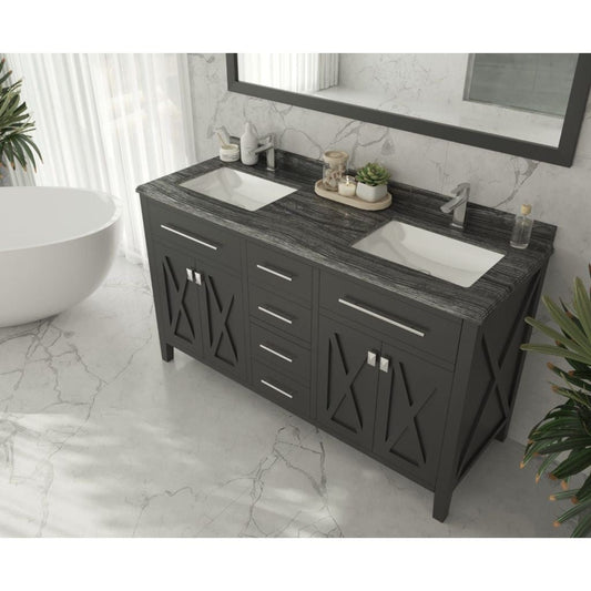 Laviva Wimbledon 60" Gray Vanity Base and Black Wood Marble Countertop With Double Rectangular Ceramic Sinks