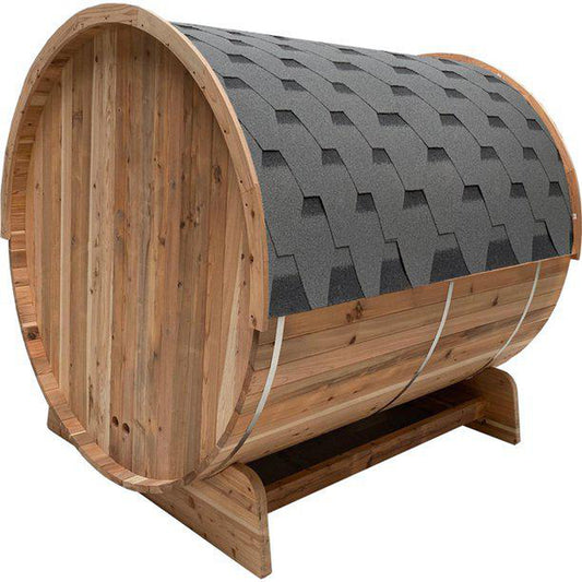 Aleko Rustic Cedar Barrel 4 Person Outdoor Wet Dry Steam Sauna With 4.5 kW Harvia KIP Electric Sauna Heater and Bitumen Shingle Roof