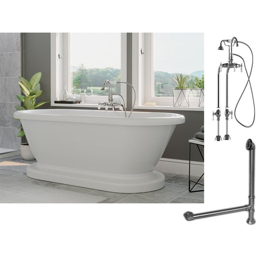 Cambridge Plumbing 70" White Acrylic Double Ended Pedestal Bathtub With No Deck Holes And Complete Plumbing Package Including Freestanding English Telephone Gooseneck Faucet , Drain And Overflow Assembly In Polished Chrome