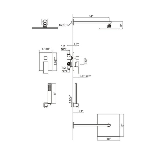 Ratel Brushed Nickel Wall-Mounted Shower System With 10" Square Rainfall Shower Head, Handheld Shower and Tub Filler Spout