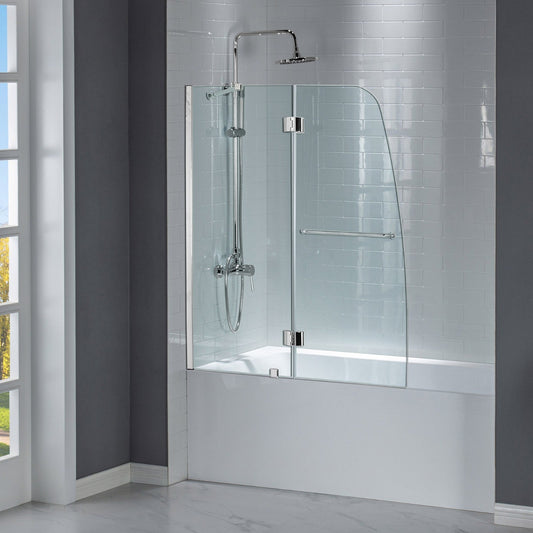 WoodBridge 49" W x 58" H Clear Tempered Glass Frameless Hinged Shower Tub Door With Brushed Nickel Support Bar and Hardware