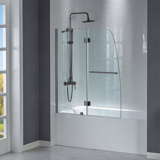 WoodBridge 49" W x 58" H Clear Tempered Glass Frameless Hinged Shower Tub Door With Matte Black Support Bar and Hardware