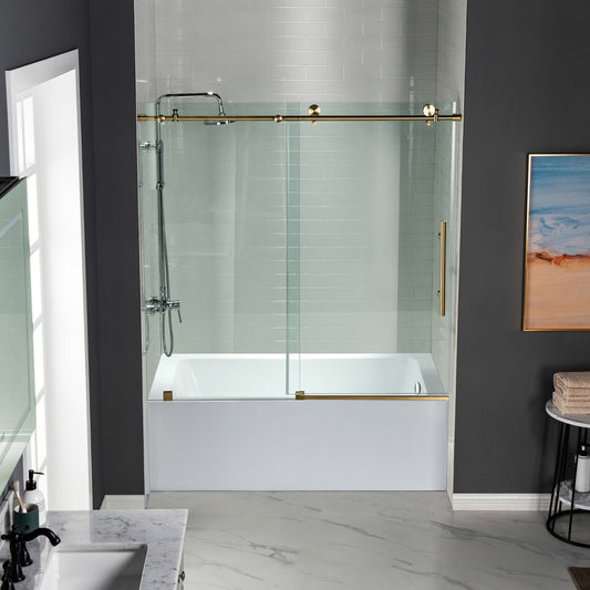 WoodBridge 60" W x 62" H Clear Tempered Glass Frameless Shower Door With Brushed Gold Hardware Finish