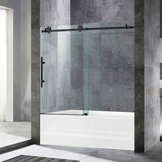 WoodBridge 60" W x 62" H Clear Tempered Glass 2-Way Opening and Double Sliding Frameless Shower Door With Matte Black Hardware Finish