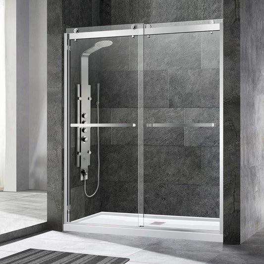 WoodBridge 60" x 34" Black Solid Tileable Integrated Center PVC Drain Shower Base With SDD6076-C Polished Chrome Hardware Frameless Shower Door and SWP603296-1-SU-H White High Gloss Vertical Pattern 3-Panel Shower Wall Kit