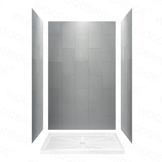 WoodBridge 48" x 36" White Solid Surface Center Drain Location Brushed Nickel Trench Cover Shower Base With MBSDC4876-B Shower Door and SWP603296-2-SU-H Matte Gray Vertical Pattern 3-Panel Shower Wall Kit