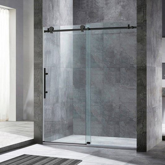 WoodBridge 60" x 34" White Solid Surface Center Drain Location Matte Black Trench Cover Shower Base With SDD6076-MBL Double Sliding Frameless Shower Door and SWP603696-1-SU-H White High Gloss Vertical Pattern 3-Panel Shower Wall Kit