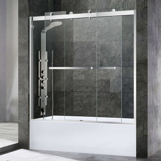 WoodBridge 60" x 34" White Solid Surface Left Drain Location Brushed Nickel Trench Cover Shower Base With SDD6062-B Double Sliding Frameless Shower Door and SWP603696-1-SU-H White High Gloss Vertical Pattern 3-Panel Shower Wall Kit