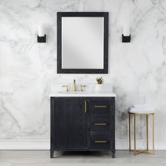 Altair Weiser 36" Black Oak Freestanding Single Bathroom Vanity Set With Mirror, Aosta White Composite Stone Top, Single Rectangular Undermount Ceramic Sink, Overflow, and Backsplash