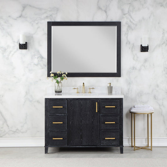 Altair Weiser 48" Black Oak Freestanding Single Bathroom Vanity Set With Mirror, Aosta White Composite Stone Top, Single Rectangular Undermount Ceramic Sink, Overflow, and Backsplash