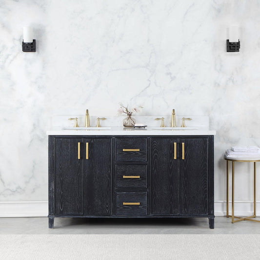 Altair Weiser 60" Black Oak Freestanding Double Bathroom Vanity Set With Aosta White Composite Stone Top, Double Rectangular Undermount Ceramic Sinks, Overflow, and Backsplash