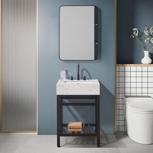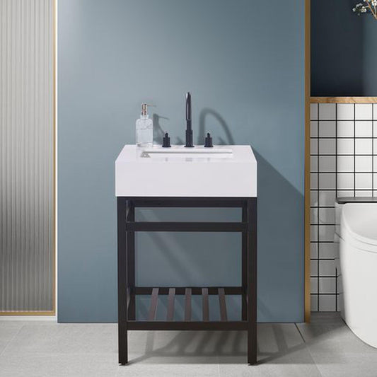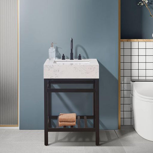 Altair Edolo 24" Matte Black Single Stainless Steel Bathroom Vanity Set Console With Snow White Stone Top, Single Rectangular Undermount Ceramic Sink, and Safety Overflow Hole