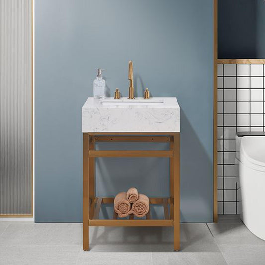 Altair Merano 24" Brushed Gold Single Stainless Steel Bathroom Vanity Set Console With Aosta White Stone Top, Single Rectangular Undermount Ceramic Sink, and Safety Overflow Hole