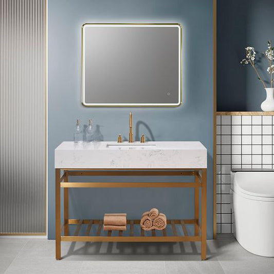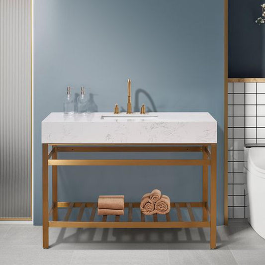 Altair Merano 48" Brushed Gold Single Stainless Steel Bathroom Vanity Set Console With Aosta White Stone Top, Single Rectangular Undermount Ceramic Sink, and Safety Overflow Hole