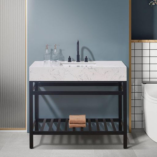 Altair Merano 42" Matte Black Single Stainless Steel Bathroom Vanity Set Console With Aosta White Stone Top, Single Rectangular Undermount Ceramic Sink, and Safety Overflow Hole