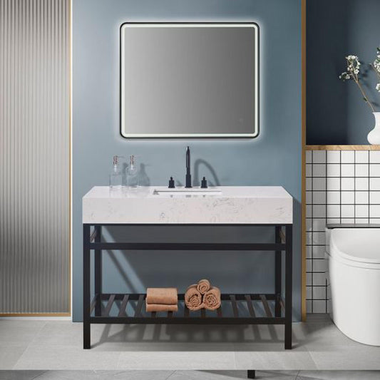 Altair Merano 48" Matte Black Single Stainless Steel Bathroom Vanity Set Console With Aosta White Stone Top, Single Rectangular Undermount Ceramic Sink, and Safety Overflow Hole