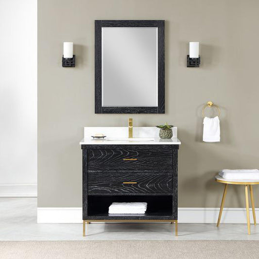 Altair Kesia 36" Black Oak Freestanding Single Bathroom Vanity Set With Mirror, Stylish Aosta White Composite Stone Top, Rectangular Undermount Ceramic Sink, Overflow, and Backsplash