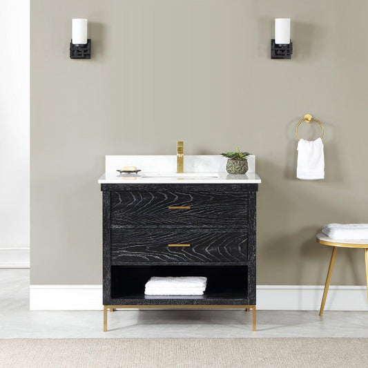 Altair Kesia 36" Black Oak Freestanding Single Bathroom Vanity Set With Stylish Aosta White Composite Stone Top, Rectangular Undermount Ceramic Sink, Overflow, and Backsplash