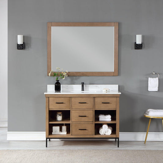 Altair Gazsi 48" Brown Oak Freestanding Single Bathroom Vanity Set With Mirror, Elegant Composite Grain White Stone Top, Rectangular Undermount Ceramic Sink, Overflow, and Backsplash