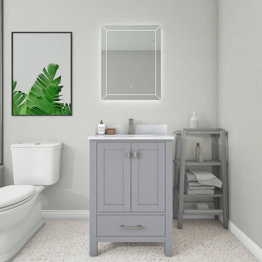 Duko Roma 24" Wooden Vanity Set With White Cararra Marble Tabletop, Rectangular Single Basin and Drawer Cabinet Gray