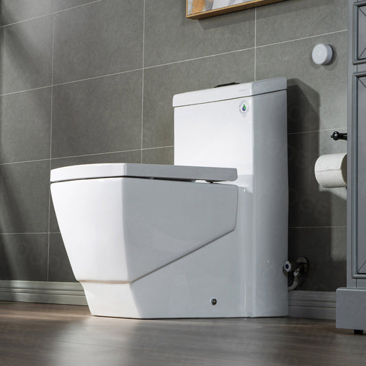 WoodBridge T-0020 White Dual Flush Elongated One Piece Toilet Chair Height With Soft Closing Seat, Deluxe Square Design