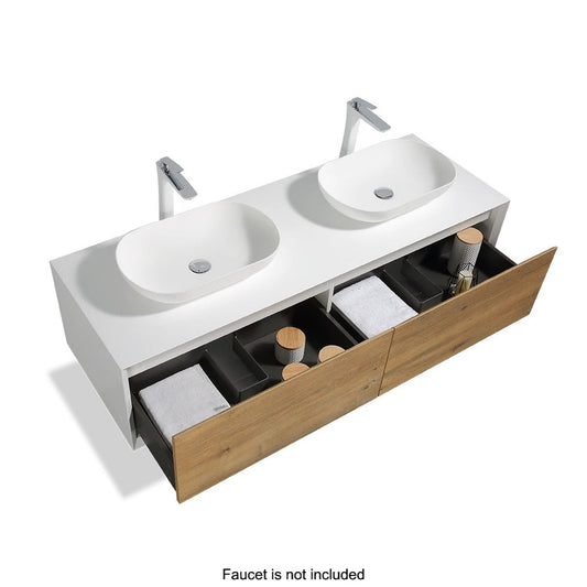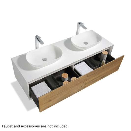 TONA Fiona 63" White Oak Grain & Matte White Wall-Mounted Bathroom Vanity Set With Lacquered MDF Countertop and Double Vessel Sink