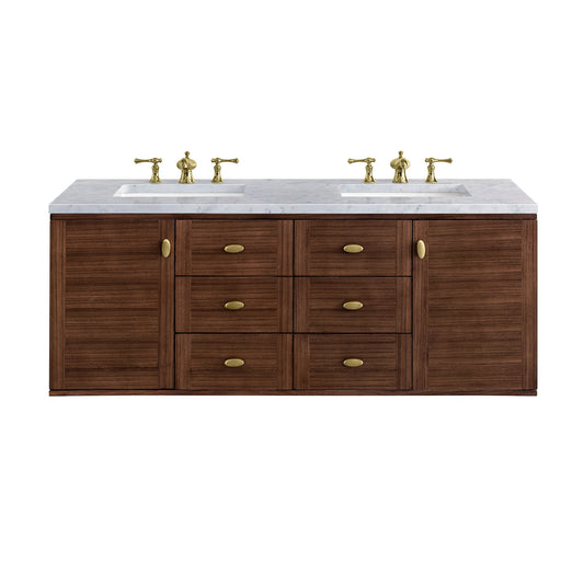 James Martin Vanities Amberly 60" Mid-Century Walnut Double Vanity With 3cm Carrara Marble Top